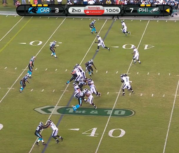 I know how the option works, the DE did pursue inside but it's hard to say if he'd seen Polk take the ball or not. The point of having that screen option in the play is to go where there's a numbers advantage, and that was to the outside. Even accepting that Vick accounted for the DE that only makes the numbers even, and Kuechly was still unblocked as Herremans was slow to come off the double on the RDT.