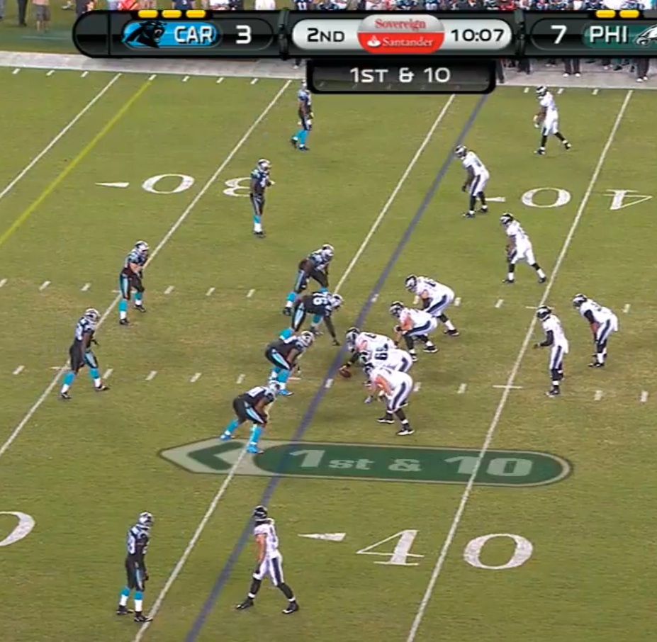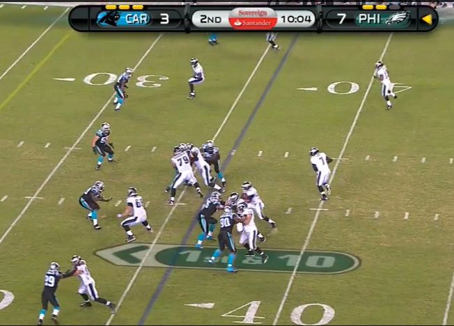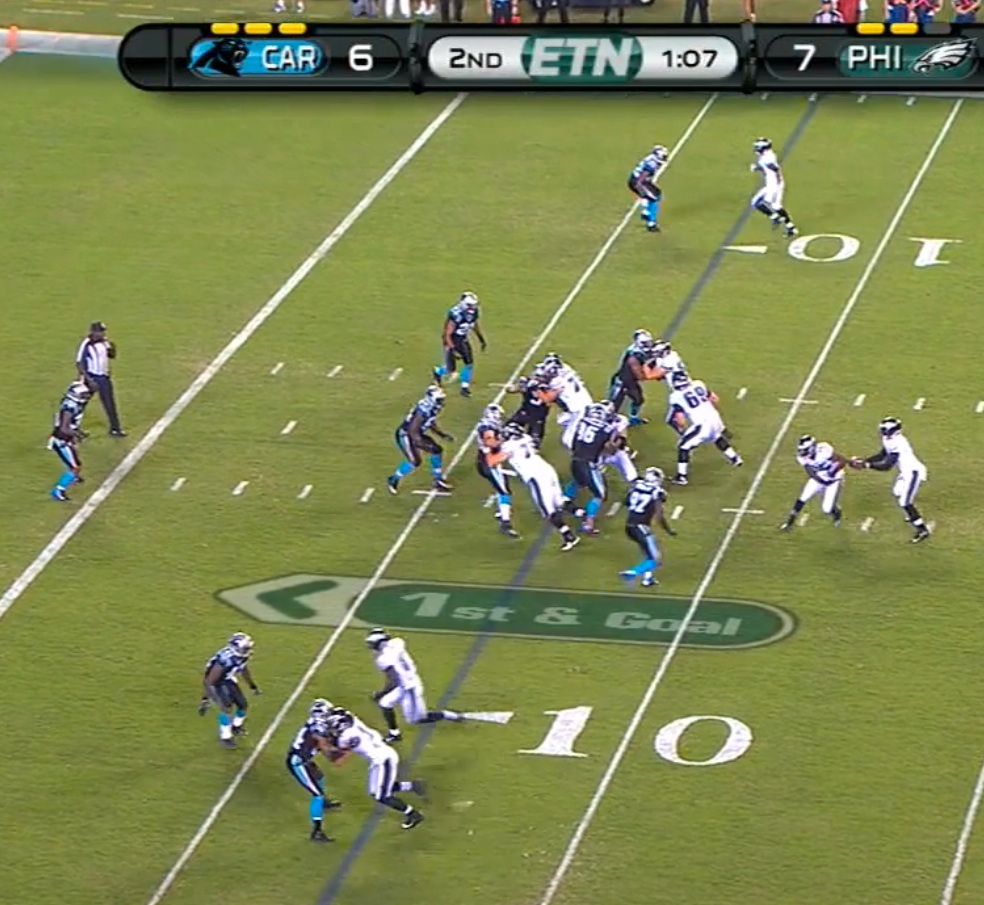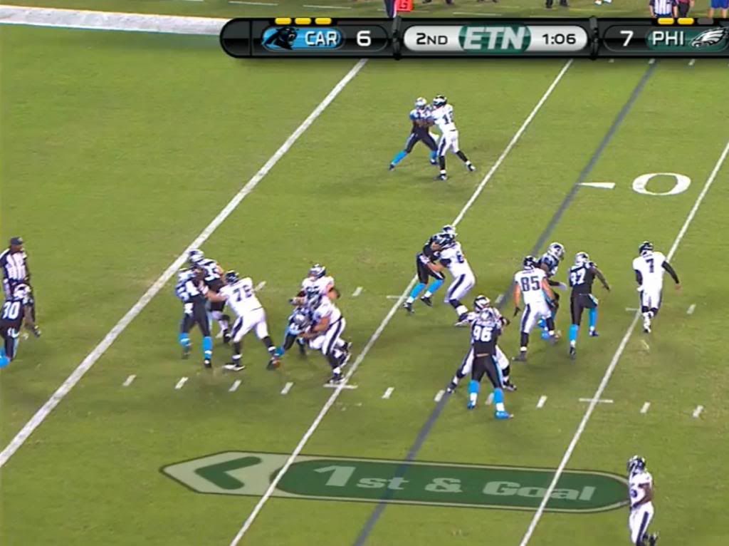 It didn't work all that well, 97 did a good job not being fooled by the Shady fake and chasing Vick down the line. This misdirection on this play could also have factored into McCoy's TD run on the next play, when it looked like the Panthers over reacted to Cooper's motion and the option threat on the right side.