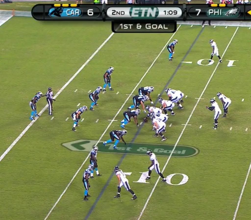 Here's an example where we have a clear 3 on 2 advantage to the top of the screen, but a 6 on 5 matchup in the Panther's favour in the box. The Panthers 2 Safeties are lined up so deep they're out of shot. This is the play Polk fumbled on, but that's not Vick's fault ;) .