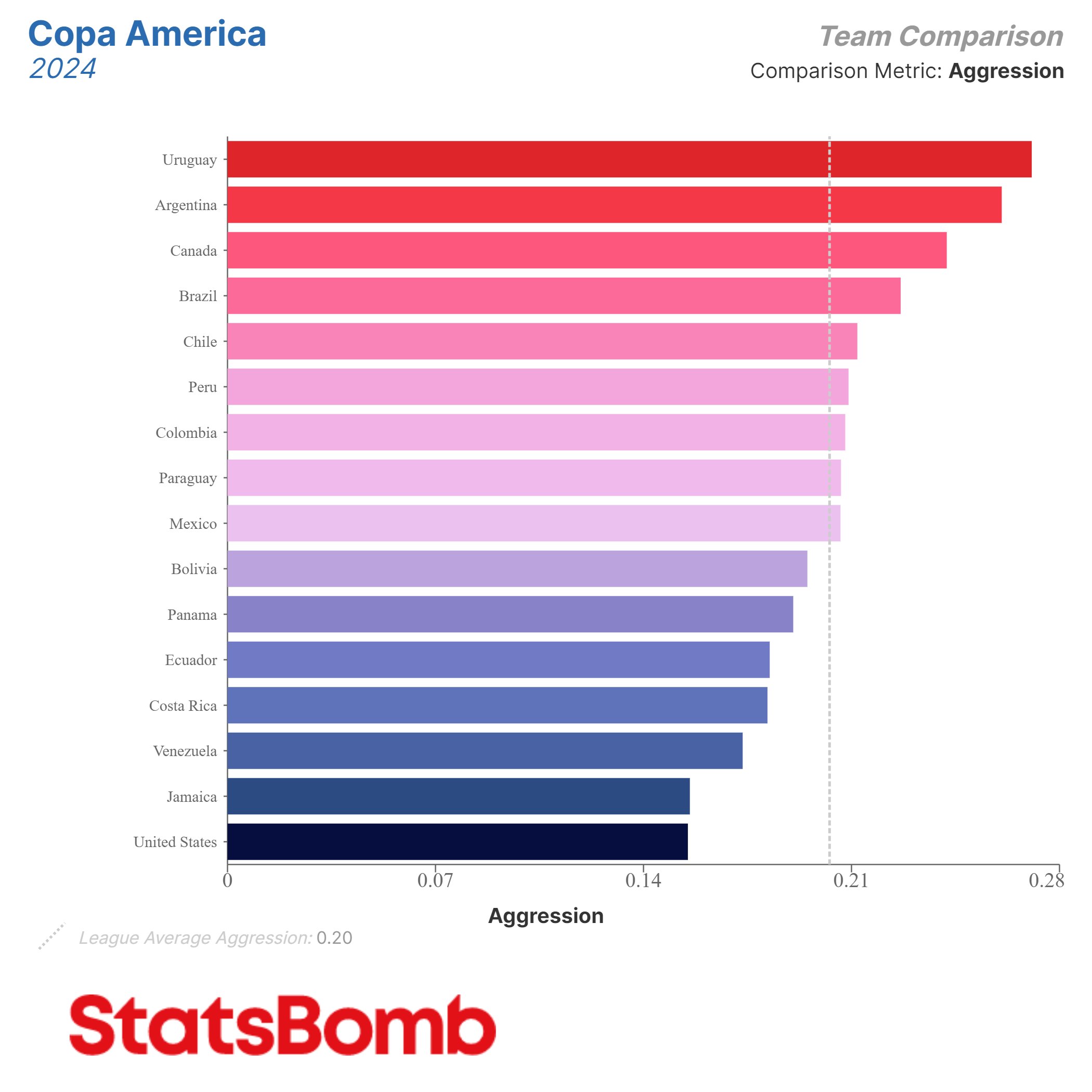 Uruguay had the highest Aggression% in the Copa América 2024 group stages: tackling, pressing, or fouling 27% of their opponent's ball receipts within two seconds