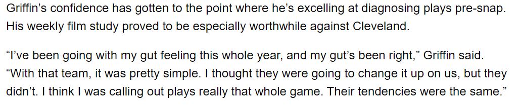 When you’re throwing the football 43 times and can’t hit 250 yards through the air, that is a bad ratio that a good football team will have no part of. When trailing badly, you have to pass the ball most of the time, but Cleveland did it when even down just 10 points. Inconsistency’s in the play calling have waved back and forth all season and we are back to this.