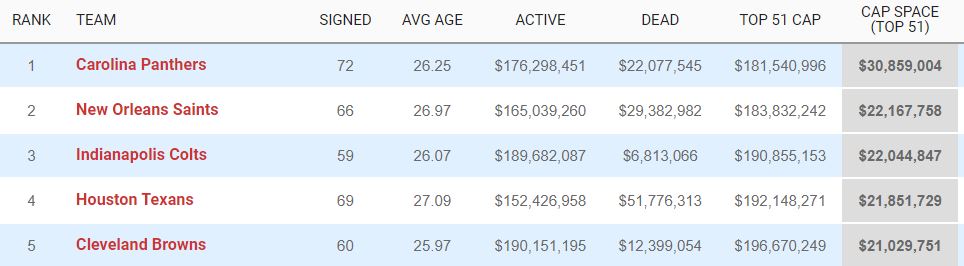 >>>>  LINK chart salary cap available top-5 NFL teams