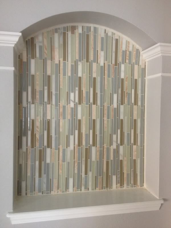 I don't live in a church. The tiled alcove is the smaller (~ 3x4) of the two we have in our house. This one is in the hallway at the entrance to the Master. The other alcove is ginormous and I have no idea what to do with it yet, but something will be done at some point. This was basically a test. First time tiling vertically for me.
