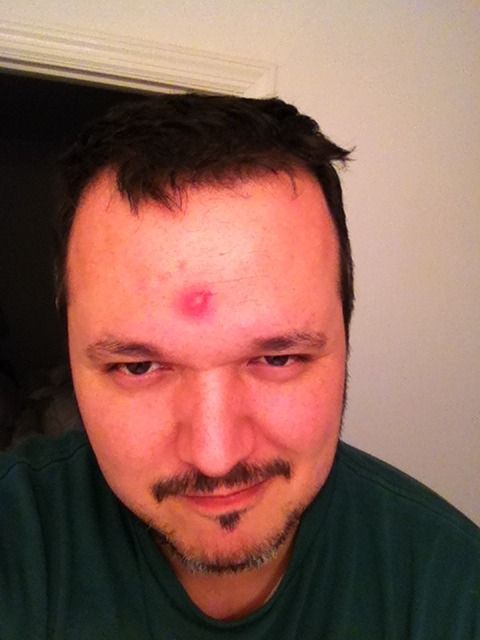 This character has popped up in the last few days, and being a greasy hairy Eye-talian, this sort of thing comes up every few years at some point on my body. This time, it decided that dead-center of the forehead was the perfect location. Happily enough, as a bartender in front of hundreds of people this weekend, it's not like anyone will notice! WOOHOO!