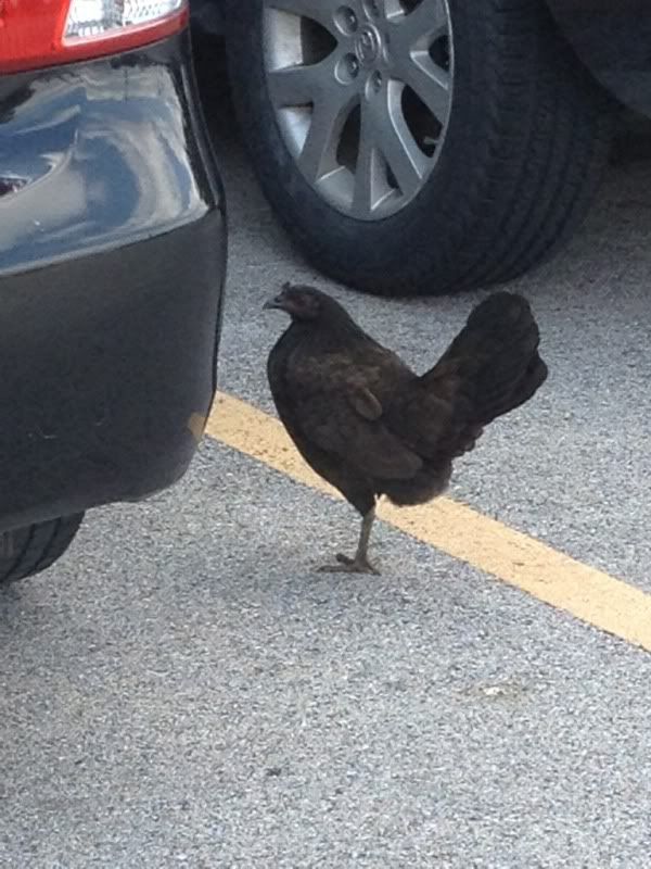Walking out to my car this evening (close to downtown Houston, BTW) and this guy was waiting for me in the parking lot. Near as I can tell is it's some kind of mutant chicken. Cos, any ideas? Should I be looking around for fresh eggs?