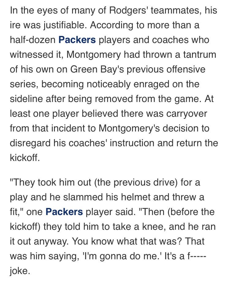 They aren’t going to cut Montgomery, but he could be a game day inactive for a while or maybe they just move on. But I think if I am on the Packers team, gonna be some trust issues there.