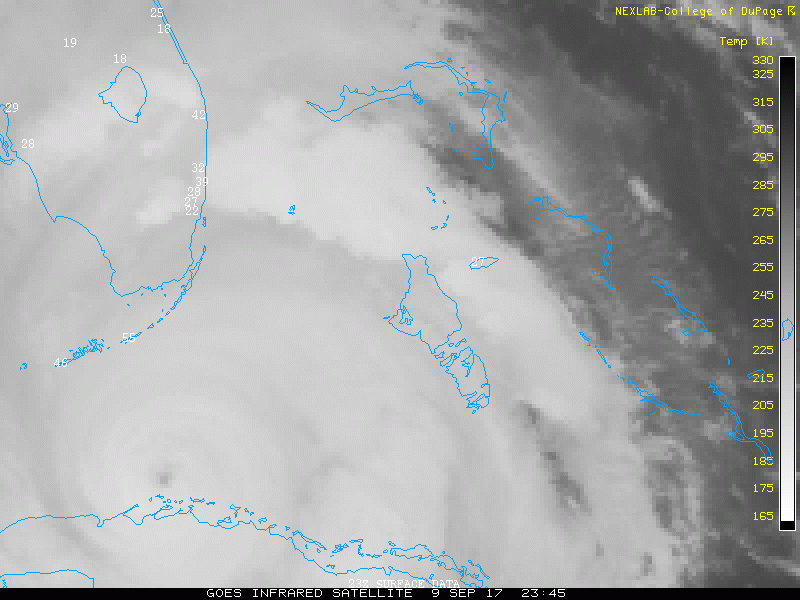 The NHC discussion says there may be some restrengthening as it moves towards FLA, but then some shear combined with interaction with land will keep if from getting back to Cat 4. Which if that holds, is great news, although a strong Cat 3 is nothing to sneeze at. Actually the latest recon only found surface winds of 95 knots (110 mph), but they kept the official winds at 105 to be conservative. The online weather nerds are questioning the NHC's analysis, but I hope the NHC is right and this doesn't get back to Cat 4.Turn from WNW to NW has happened. Next it'll go straight North. How long it gets to do that before hitting land should decide the strength it can get to.