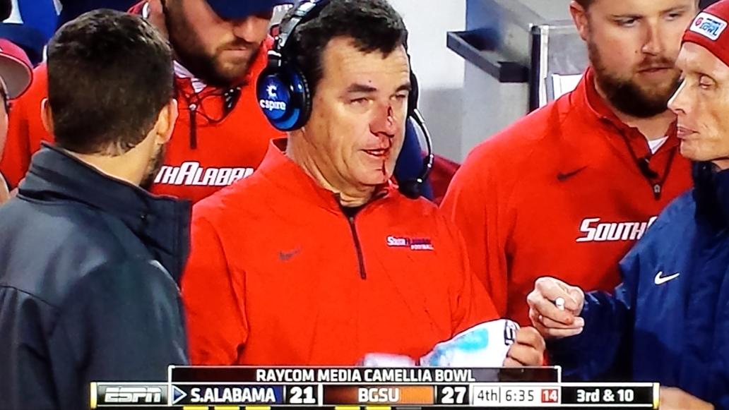 I don't know what's funnier, that, or the ref who has a serious injury to show everybody, stop the game for 10 minutes, and bring in the chick ref to take his place.Total dumpster fire. Runs read-option with path to endzone and cuts back to traffic then fumbles next play.This South Alabama Qb is horrific.
