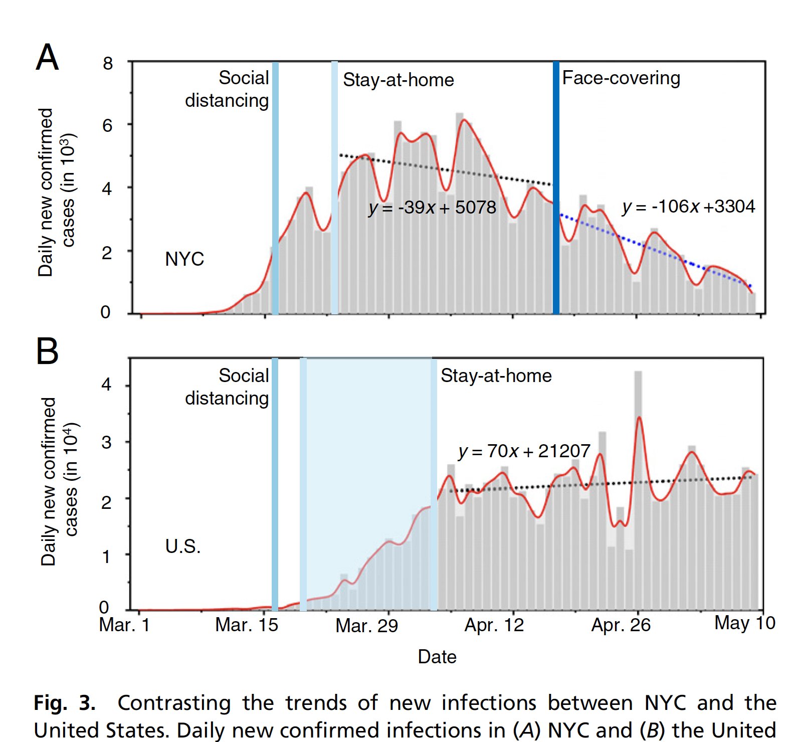 New-infection trends in NYC after implementation of (a) social distancing, (b) stay-at-home orders, and (c) mandatory face coverings. (from Topol's tweet)