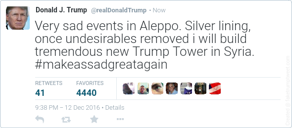 So sad seeing the slaughter of all those people in Aleppo at the hands of Putin and Assad. So grim that the West just turned a blind eye. We could have taken in so many more refugees.