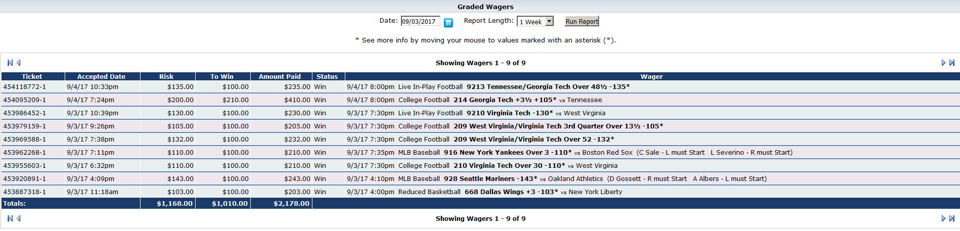 Yes - punched the over twice last night...then thinking it didn't go through, placed it again at BOL. Luckily got a hedge in at Heritage in teh 4th quarter. GT hits that game winning FG and I win them allAnyone else get a "something went wrong" every time they make a bet on mybookie, and the bet still goes through