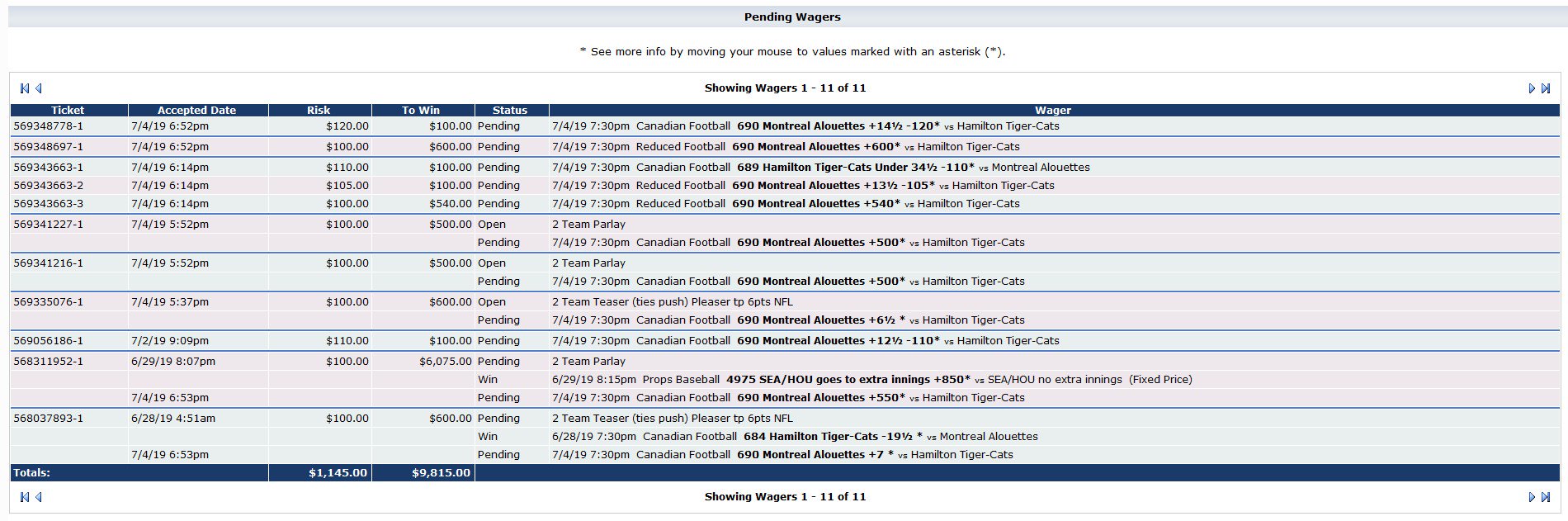 I'm going in for more. Last game was rookie head coach Khari Jones' second career game - two road games to start his career as head coach - and quarterback Vernon Adams' first start of the season after replacing starting QB Antonio Pipkin in G1 (a game in which Adams erased a 17-point fourth-quarter deficit to tie the game before Edmonton pulled out a win in the final two minutes). Their last game in Hamilton was a beat down, but the defense had some good plays with 3 picks (including one in the end zone) and a big goal line stand from the 1 yard line. The D won the turnover battle and won TOP by more than 13 minutes. "By some of the tried and true measures we use to figure out whether a team should win or lose, the Ticats were steamrolled in two of them." It was just the big plays and failure to capitalize on turnovers that doomed the Als last game. That's what makes the 13½ points feel even more ridiculous, yet public keeps piling on the fave and driving the number up. Fingers crossed the Als get better tackling and limit big plays now that HC can finally step on his home field for the first time, and maybe the Als become more fun to bet on after getting their bearings after all the changes in 2019.