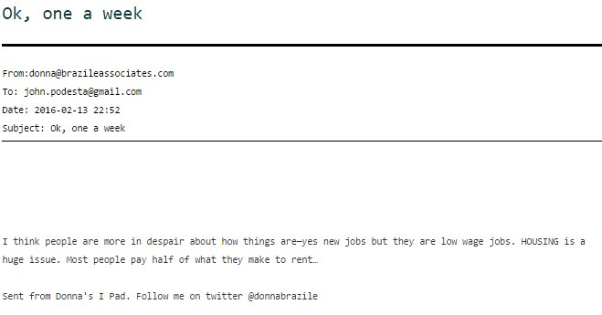 Also, I think people are kinda losing an important angle of this Wikileaks stuff- assuming it's not fraudulent, you're talking about illegally obtained information. Not just that, but unlike a lot of the Wikileaks stuff from the past, neither side of these exchanges is a government entity.  In other words, they can't possibly claim the moral high ground here. There is no universe in which we the people can possibly think that we have a right to see this stuff. And even if there were illegal or FEC rule-breaking activity identified here, the US government probably should not act on it, because that would encourage further unlawful attacks on US citizens.