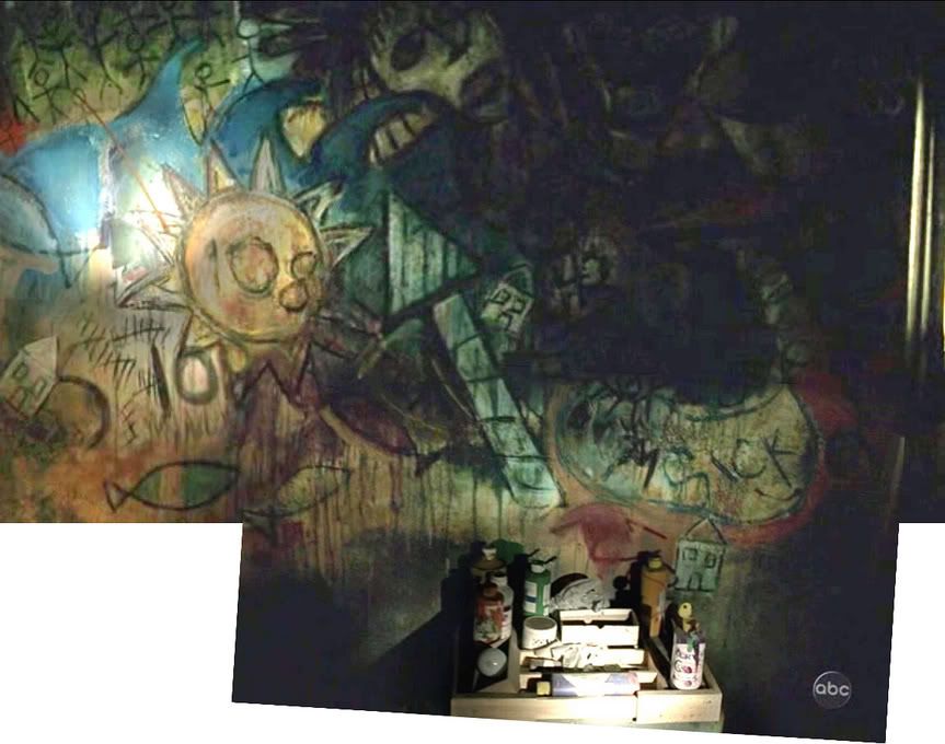 good point. Since they are from old episode they are fair game. When I first looked, I thought it may be a newer part of Claire's flashback to be revealed in upcoming weeks. So... the painting and murals are very close in color and shape. Unless the writers are very very sloppy, there must be some connection (not necessarily saying Claire's baby's father was actually in the hole or Desmond himself).