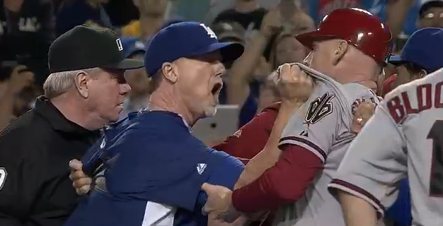 Benches empty, no punches thrown. Baseball fight.