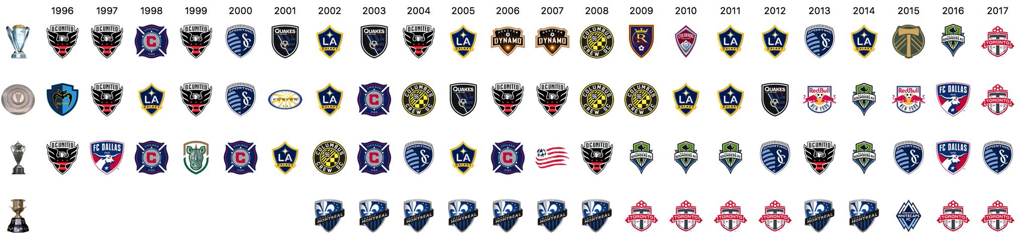 from top to bottomFor those of us who are still relatively new to MLS and following NA football, can you explain what the 4 trophies are? I'm guessing that the top line is MLS Cup Champion? The bottom appears to be something strictly about Canada??