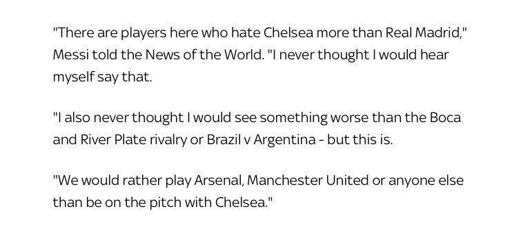 That's an interesting comment. I'd like to see the context. Messi himself has had bad luck against Chelsea (his next goal against CFC will be his first), but I would not have expected Chelsea to even be on his radar in terms of a rivalry. From Chelsea's perspective, if one were to list the top 10 most memorable moments of the past 20 years, easily half or more could come from the games against Barca during that period. I'm very happy with this draw, even if CFC is a big underdog. I think it will be the first time Cesc and Pedro face their old club. I'm disappointed with City v Basel, otherwise its a pretty good draw.