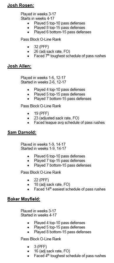 I'm not saying that the book is closed on Rosen and that he's a bust, but the narrative that he struggled while the other rookies looked competent because his situation was so much worse when compared to the others is false. The Jets or Bills don't have anyone close to Larry Fitzgerald or David Johnson on their roster and all three offensive lines were putrid, the difference being Darnold and Allen were better equipped to avoid the rush as they're more athletic than Rosen.