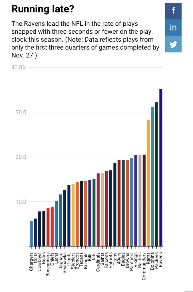 In light of recent events, I looked at how often teams snap the ball with 3 seconds or fewer on the play clock. Guess which bar is the Ravens’ bar.