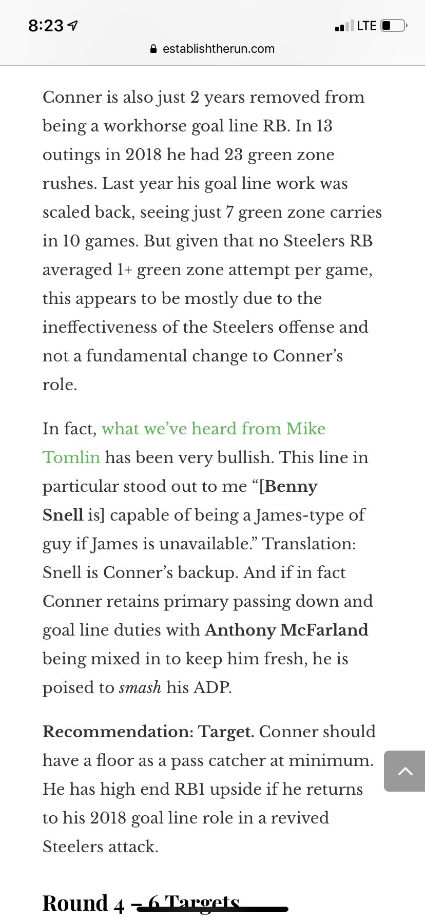 Matt: Extremely appealing value this year. He goes around the Round 3/4 turn at the earliest but his ceiling is far higher than that selection point indicates. If Conner becomes the latest “he was injury-prone until he wasn’t” running back and stays healthy next season, he’s in a prime smash spot. He was the RB6 overall in 2018 despite playing just 13 games. The variables haven’t changed to a wildly drastic degree. The Steelers still have an established offensive line, there aren’t many big-time competitors for touches behind him and good enough weapons in the passing game to be a top-15 offense. That’s all the ingredients you want in a fantasy back. As long as his ADP stays manageable, I’ll be in on Conner.