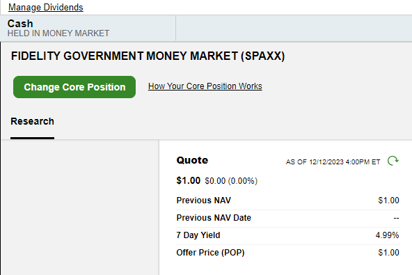 If you click on Cash (Held in Money Market) you'll see all cash is placed in SPAXX (Fidelity Gov Money Market).