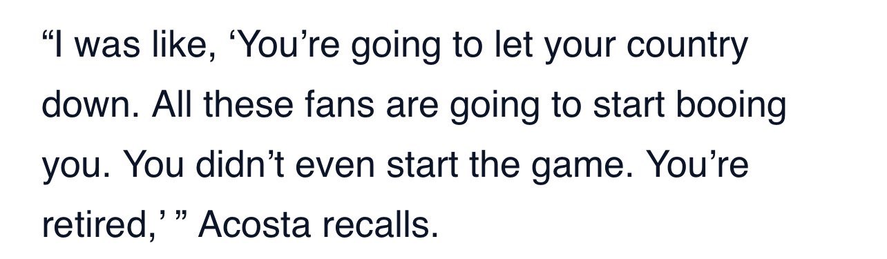 “I was just saying, ‘You’re going to let your country down. You’re going to miss it. I’ve seen you try to chip it before. You’re wearing No. 10 for no reason. You might as well take it off. You’re just out here. They should put a cone out there instead,’ ” Acosta remembers